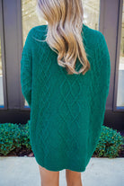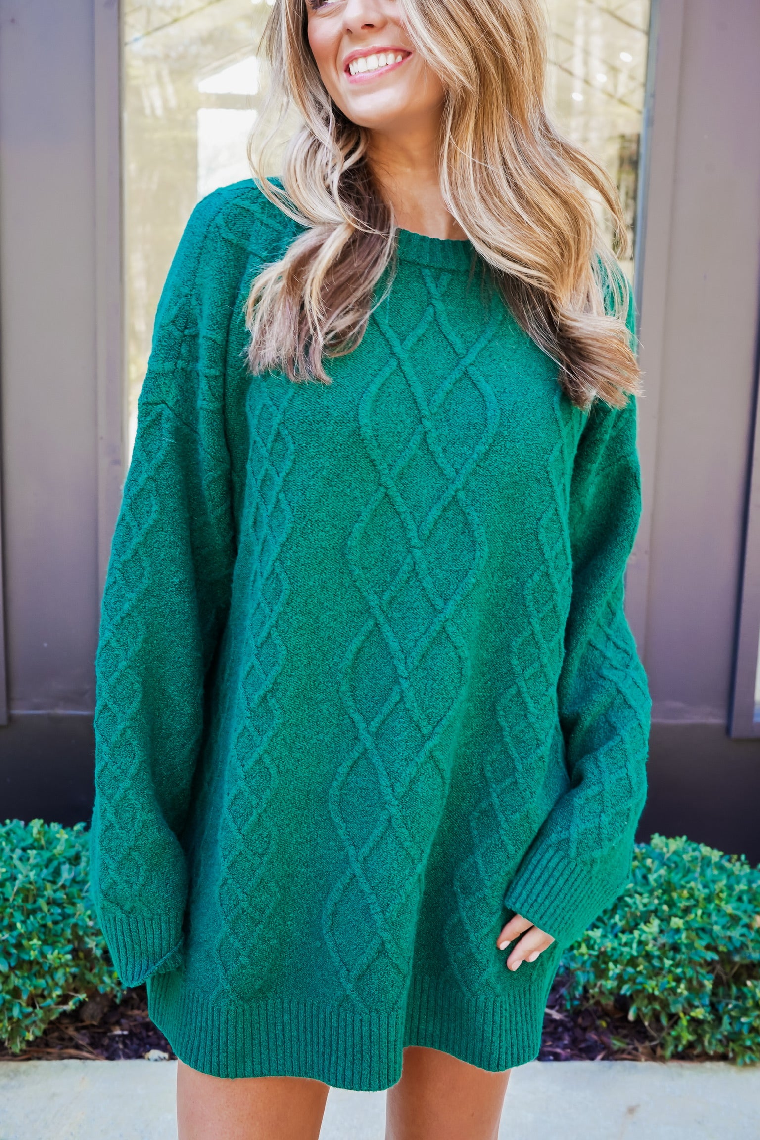 A cozy holiday essential you'll be wearing on repeat! This classic emerald cable knit is perfect for festive days and chilly nights. Style it as a sweater dress with tights and boots for seasonal gatherings, or layer it under jackets with jeans to stay warm all winter long.