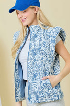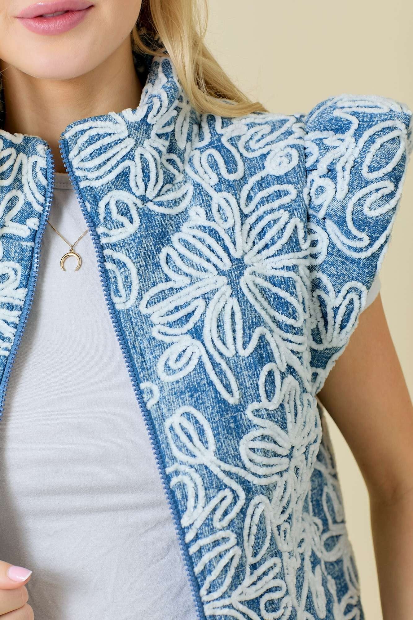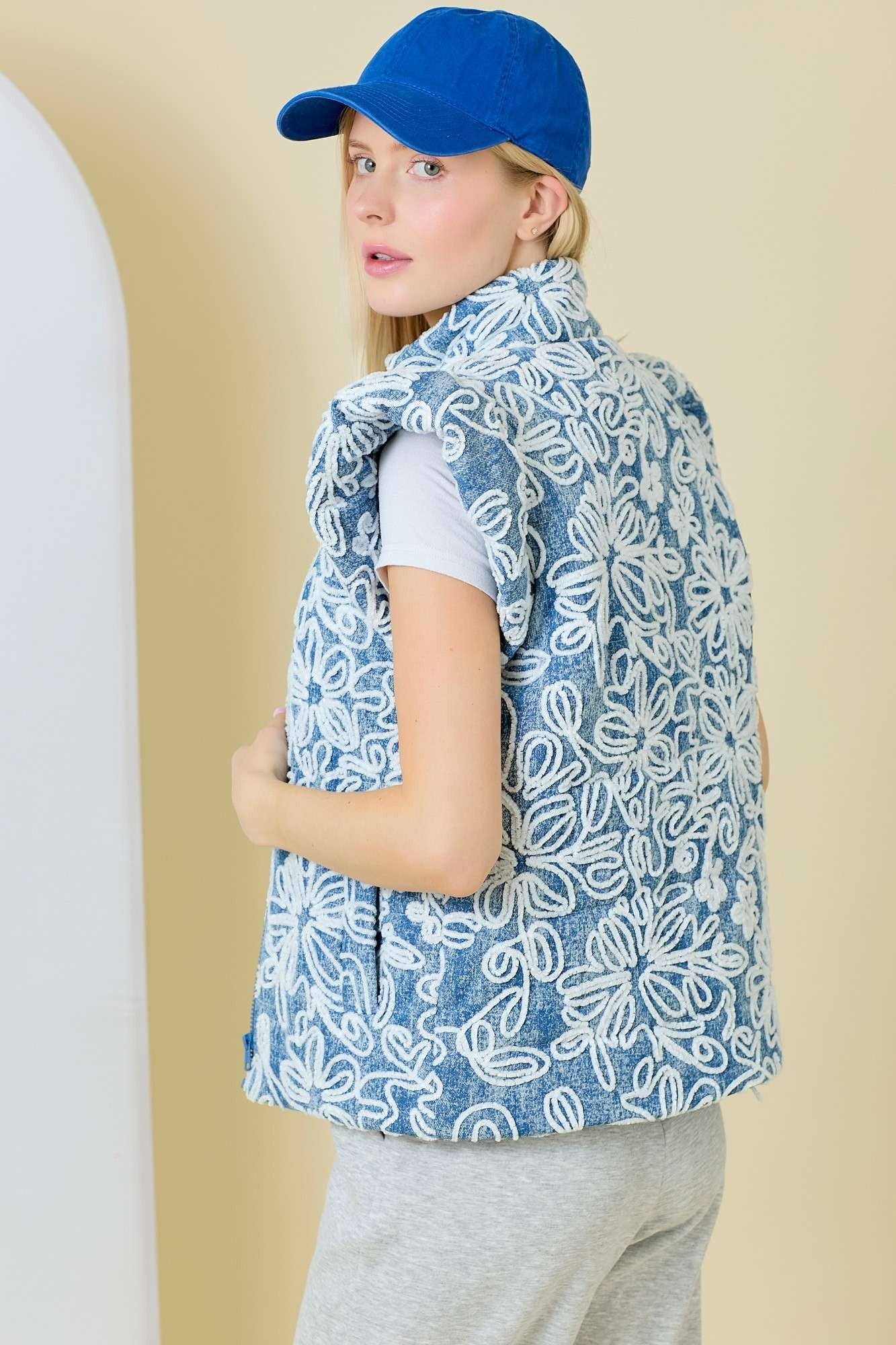 Transform your style with the Cypres Vest! This floral velvet embroidered denim puffer vest will elevate any outfit and keep you warm all season long. Make a statement with this unique and fashionable piece. Limitless style possibilities await you!