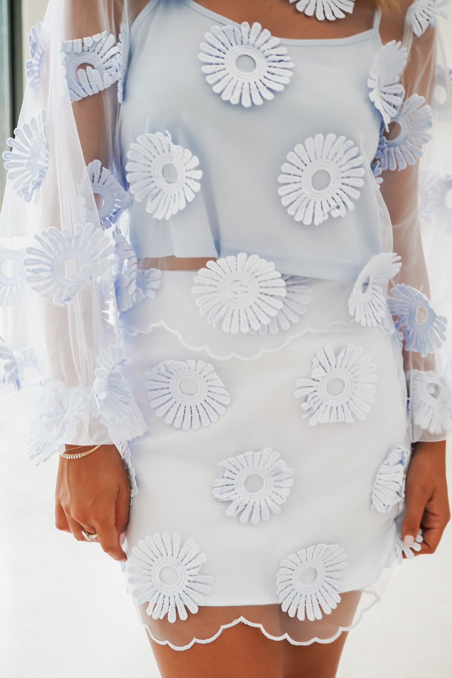 Elevate your style with the Daisie Set, featuring a light blue two-piece ensemble designed to turn heads. The long sleeve sheer mesh crop top showcases delicate 3D daisy flower appliques over a matching tank top, adding a fresh, feminine touch. Finished with scalloped edges, it pairs perfectly with the coordinating straight mini skirt for a chic, cohesive look. Ideal for making a statement at any event, this set blends playful elegance with modern flair!