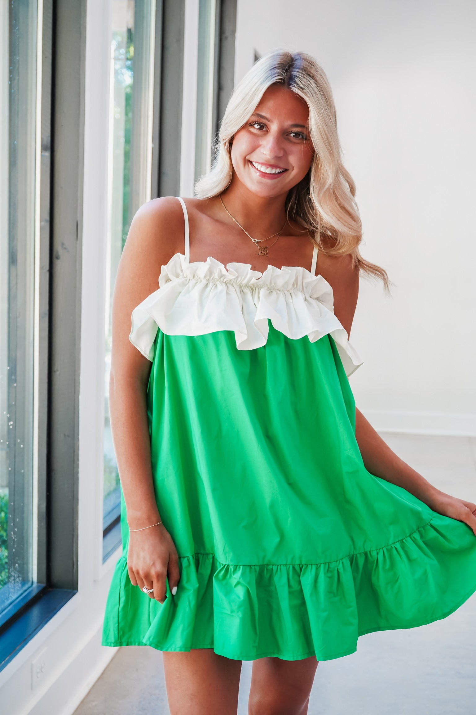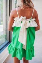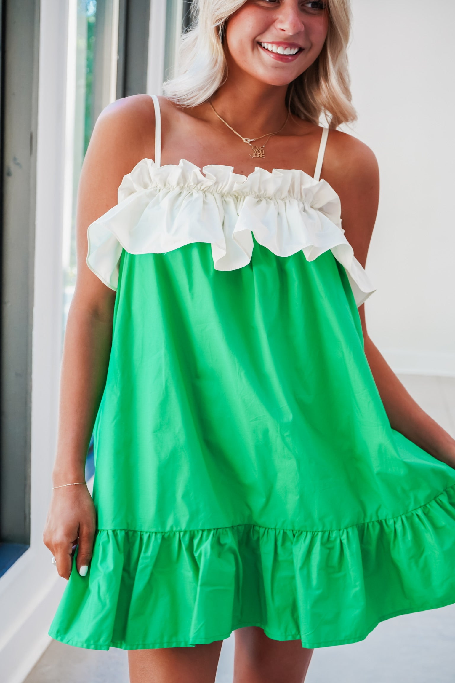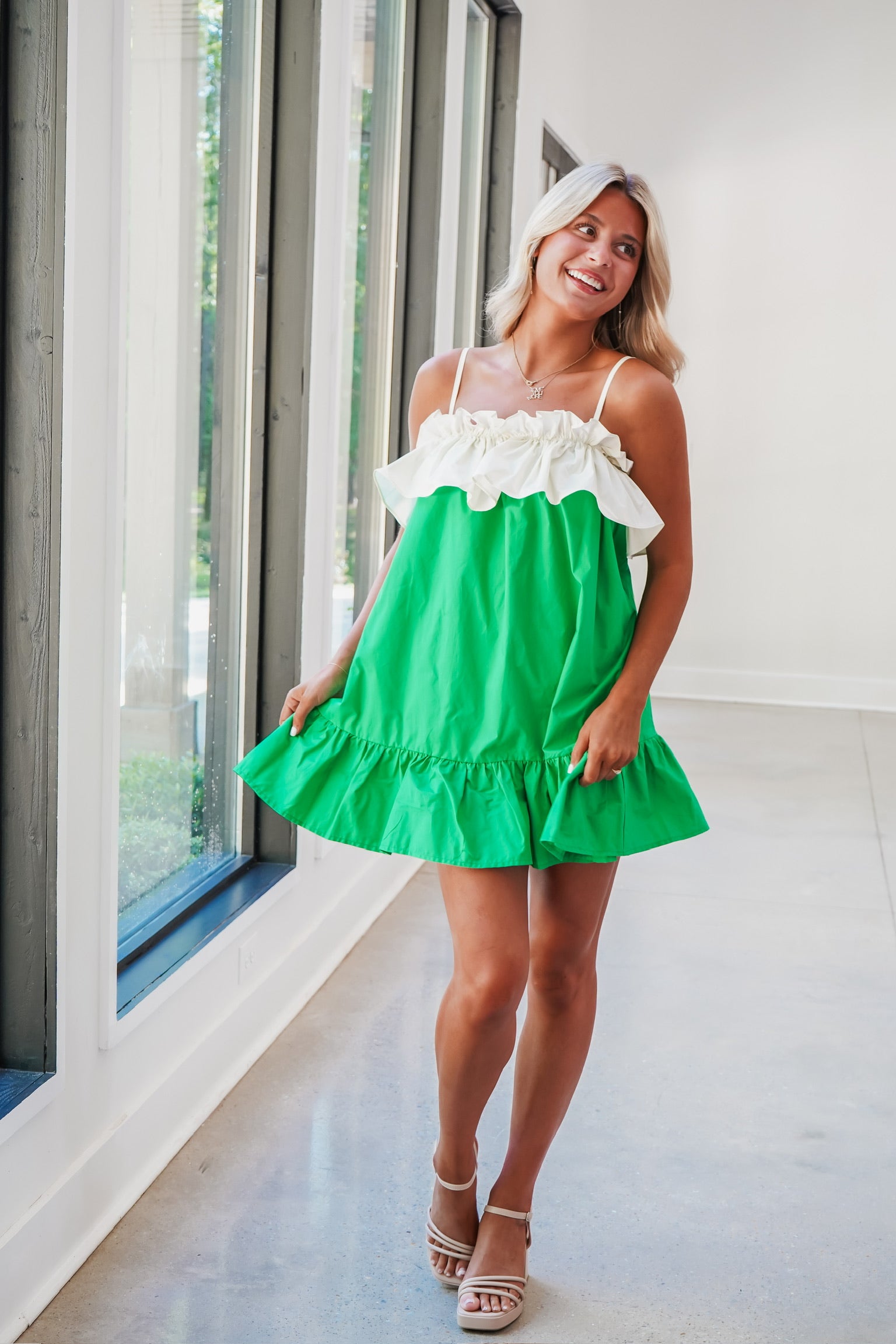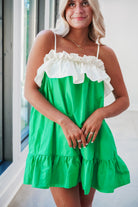 Get ready to make a statement in our Elaine Mini Dress! This playful green sleeveless dress features a contrast cream ruffle bodice and square neckline for a unique touch. The low waist hem adds a flattering silhouette, while the open back with bow detail adds a touch of fun. Perfect for any occasion!