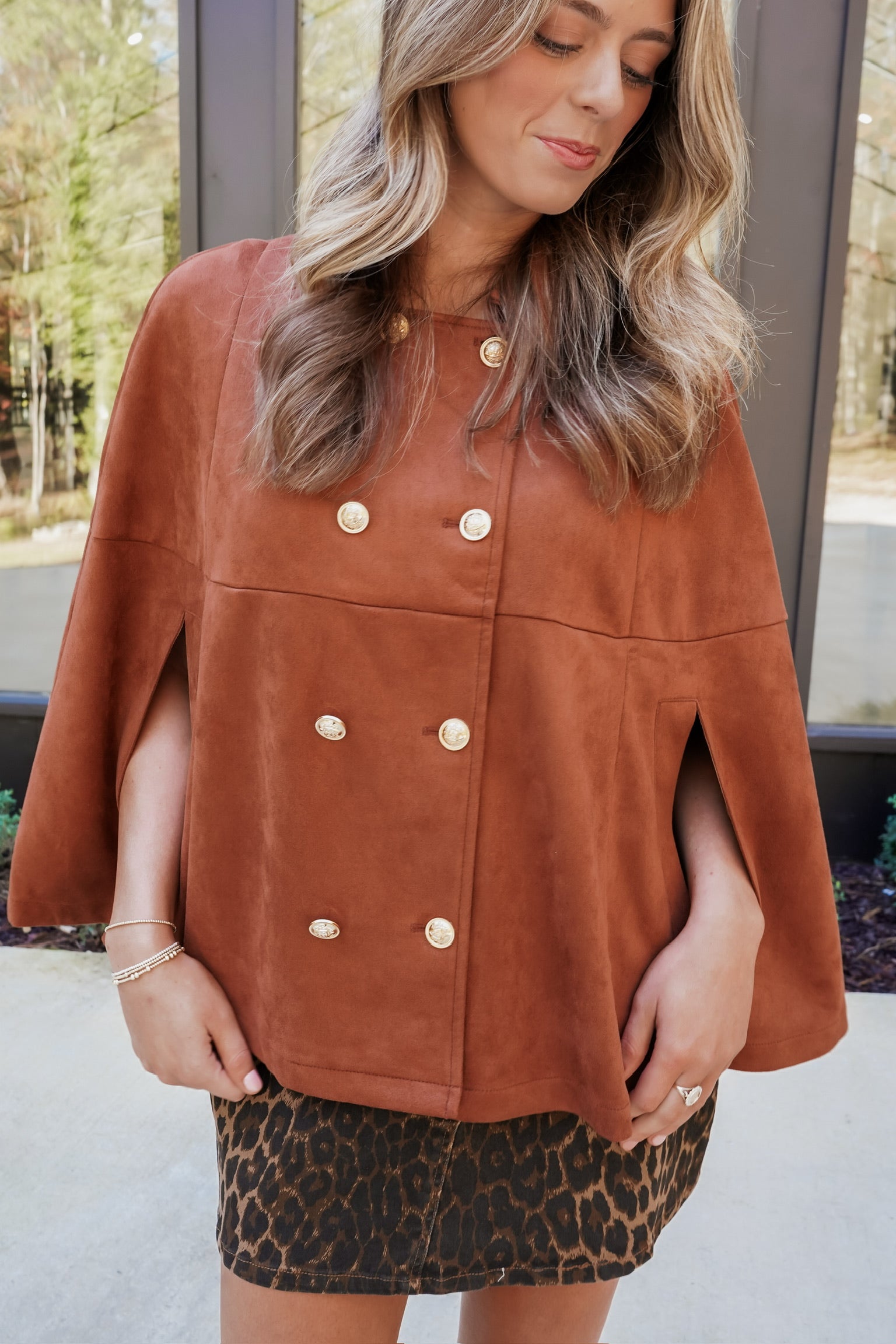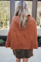 The Frances Jacket is your new go-to for effortless elegance. This rich brown suede cape jacket features a chic double-breasted silhouette that drapes beautifully, paired with gleaming gold button details that catch the light just right. Perfect for layering over everything from casual tees to evening wear, it's the kind of piece that makes any outfit feel instantly more polished. Wrap yourself in luxury and attitude!
