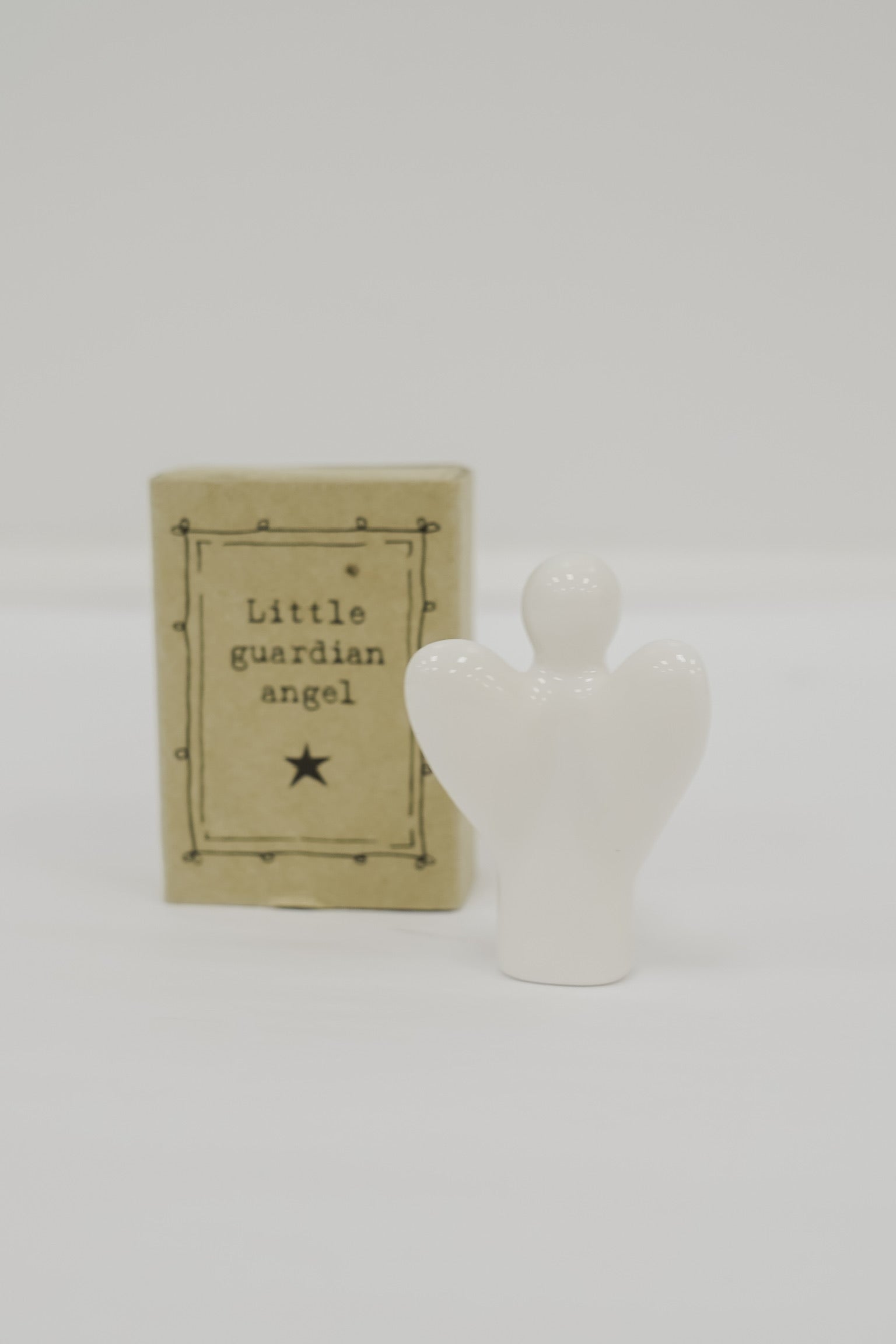 This porcelain guardian angel is the perfect gift! The 1.75" tall white porcelain angel is presented in a dainty 'matchbook' style box decorated with the words; ‘Little guardian angel’. This porcelain decoration can be placed on a shelf, window sill or table to stand proudly and watch over your loved ones, or kept even closer in a bag or pocket. This makes a thoughtful and meaningful gift for anyone.