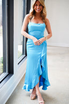 Be the belle of the ball in the Jenny Maxi Dress! This stunning, strapless satin dress features a strappy back closure and a high ruffle side slit for a touch of sass. Perfect for any formal event, this dress is sure to turn heads and make a statement. (No one will be able to take their eyes off you!)