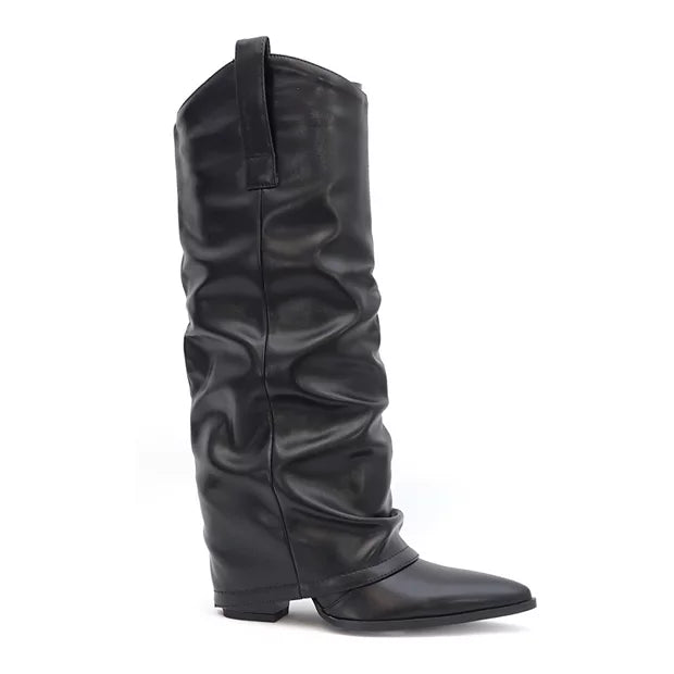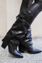 The Kween boot is an eye-catching western style! Crafted with faux black leather, this stylish sheath boot is the perfect addition to any cowgirl's wardrobe! Features include a slouchy fit and a low-profile block heel for maximum comfort and style!