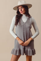 The Kylie Dress is the perfect addition to your wardrobe! This sleeveless knit sweater mini dress features a flattering v-neckline, playful ruffle hem, and a unique cable knit twist braid detail. Not only is it stylish and versatile, but it's also comfortable and perfect for any occasion. Elevate your look and feel confident in the Kylie Dress.