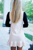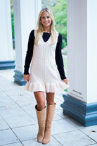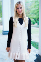 The Kylie Dress is the perfect addition to your wardrobe! This sleeveless knit sweater mini dress features a flattering v-neckline, playful ruffle hem, and a unique cable knit twist braid detail. Not only is it stylish and versatile, but it's also comfortable and perfect for any occasion. Elevate your look and feel confident in the Kylie Dress.