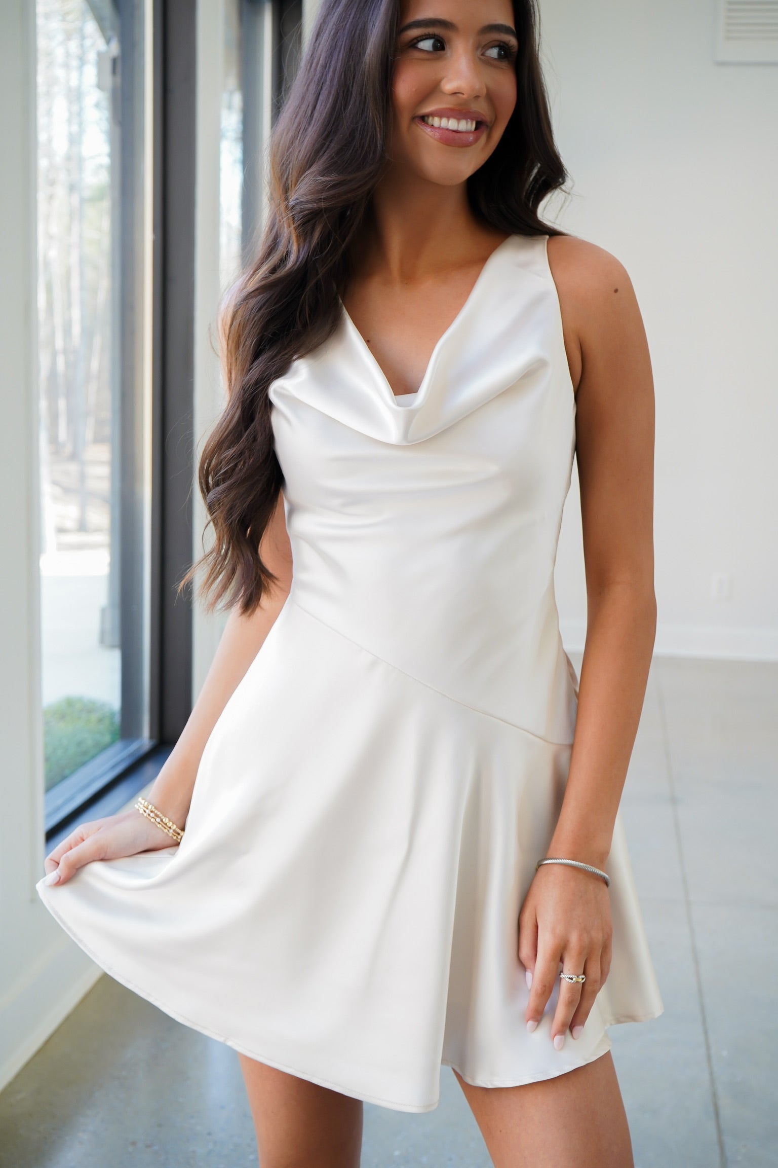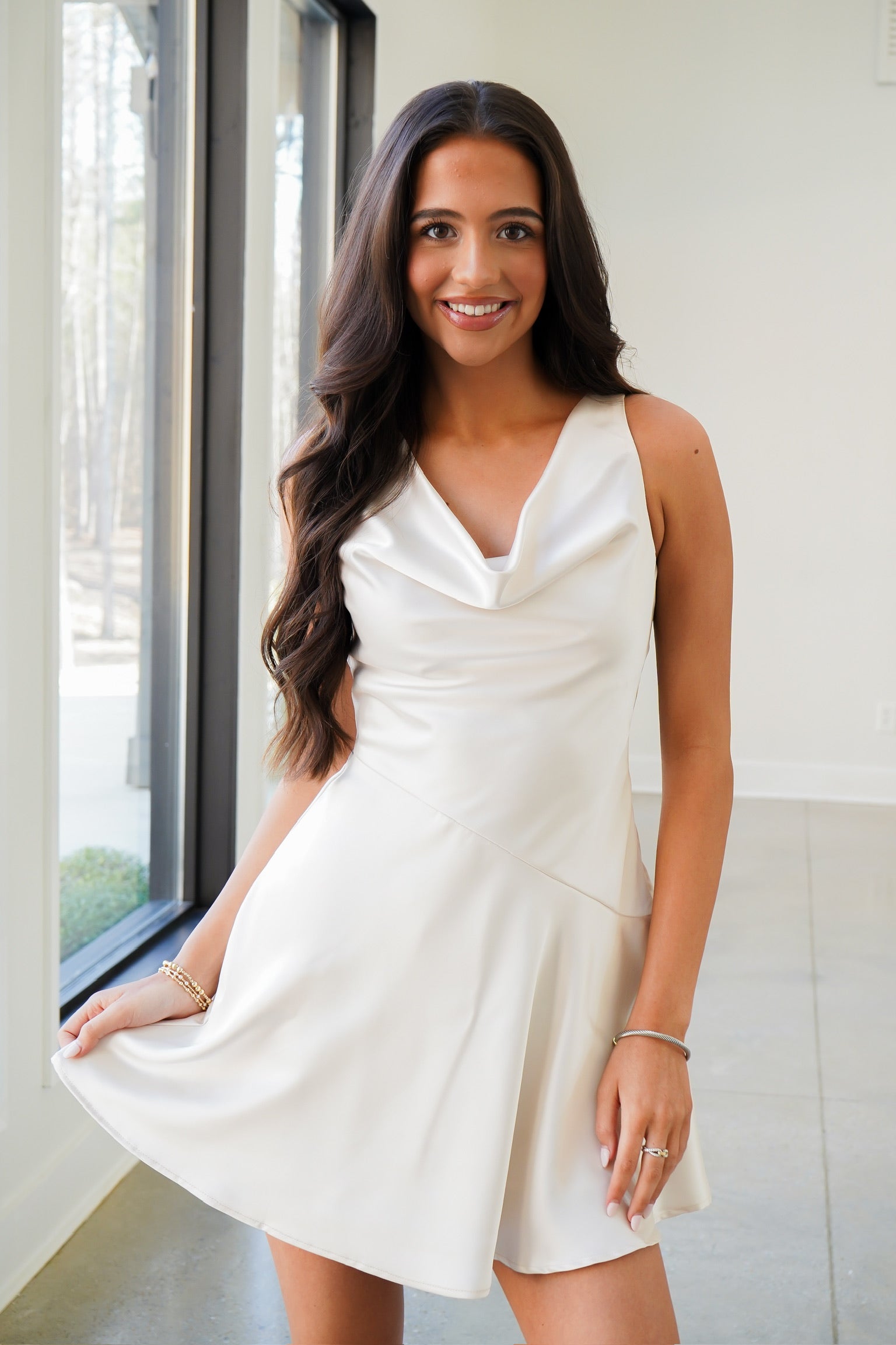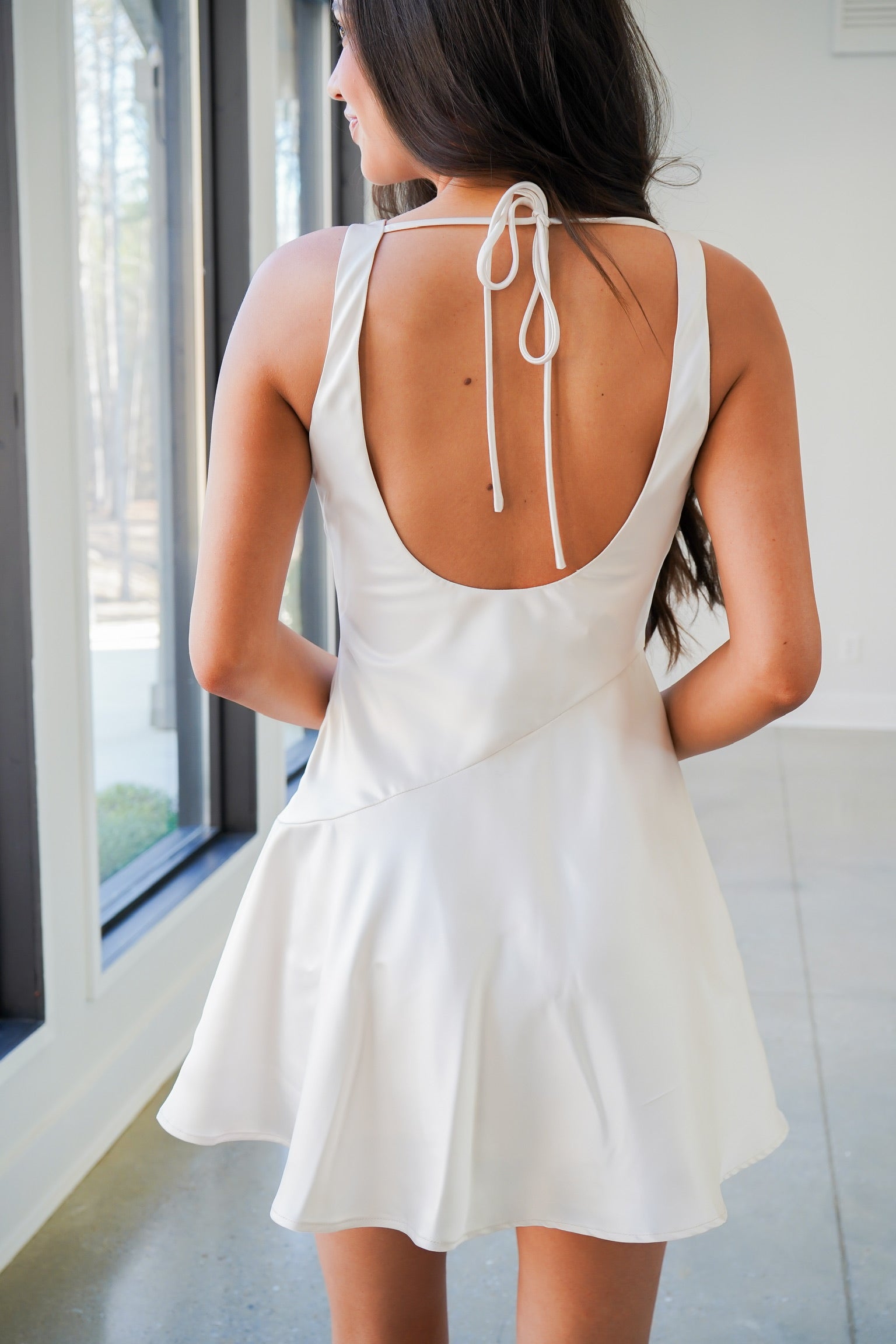 The Lopez Mini Dress is a must-have for any fashion-forward individual. Made with luxurious satin, this sleeveless mini dress features a beautiful cowl neckline and an asymmetrical design, adding a touch of elegance to any occasion. The open back with tie closure adds a playful touch. Experience comfort and style in one chic dress.