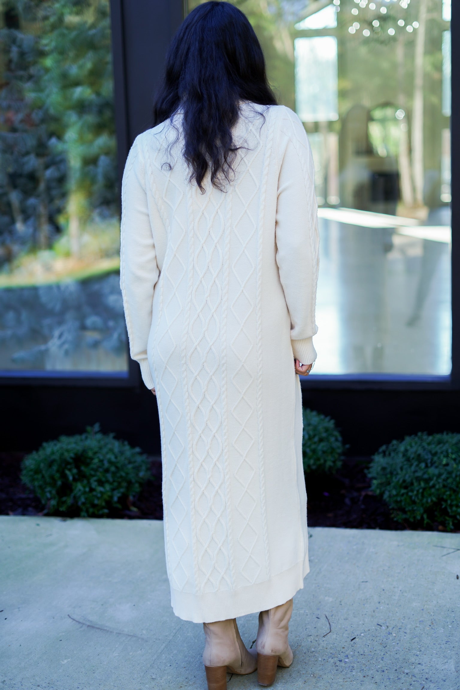 With drop shoulders, cable knit detailing and a ribbed turtleneck you will love this timeless knit midi dress. Cinch the waist with your favorite belt or leave as is for a cozy comfy winter look.