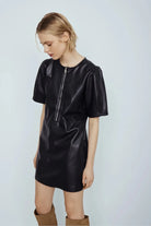 Get ready to make a statement with the Naiya Dress! Made with faux leather, this dress features a unique quarter zip design and stylish puff shoulder detail. Designed by Melissa Nepton, this dress is the perfect combination of chic and comfort for any occasion.
