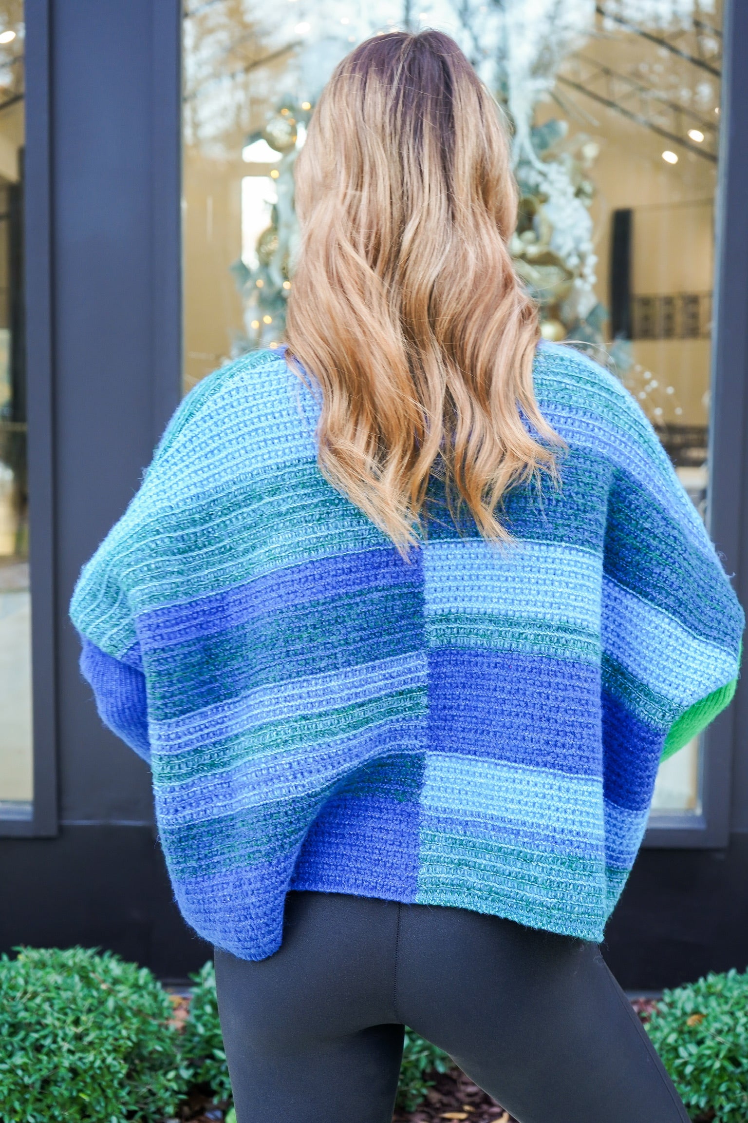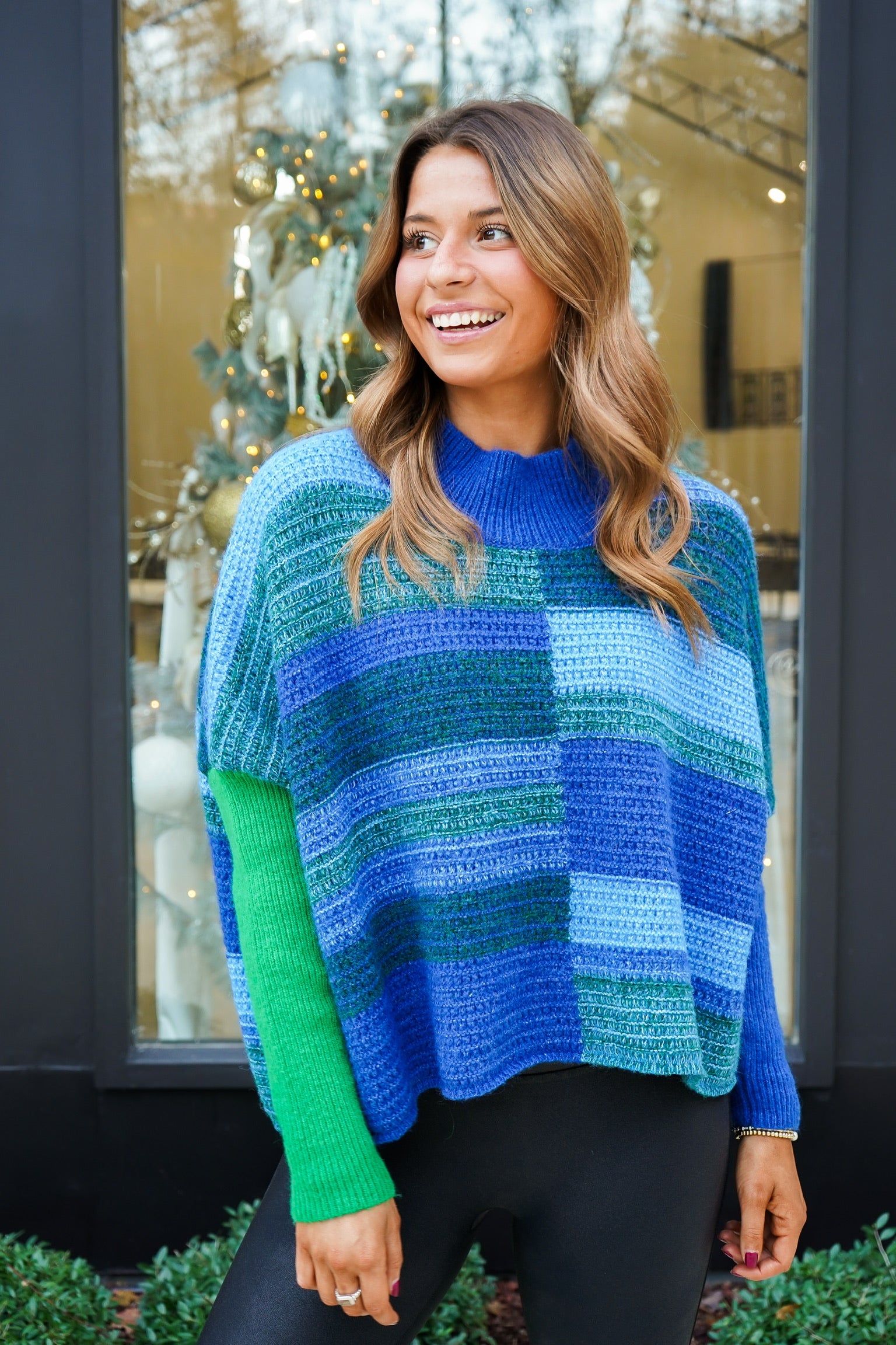 Experience ultimate comfort and style with the Neo 'Aja' Sweater. From the renowned brand Kerisma, this sweater features a beautiful blue mix ombre pattern, complemented by fitted rib colorblocked sleeves. The boxy mock neck adds a touch of sophistication. Elevate your wardrobe with this versatile and trendy piece.
