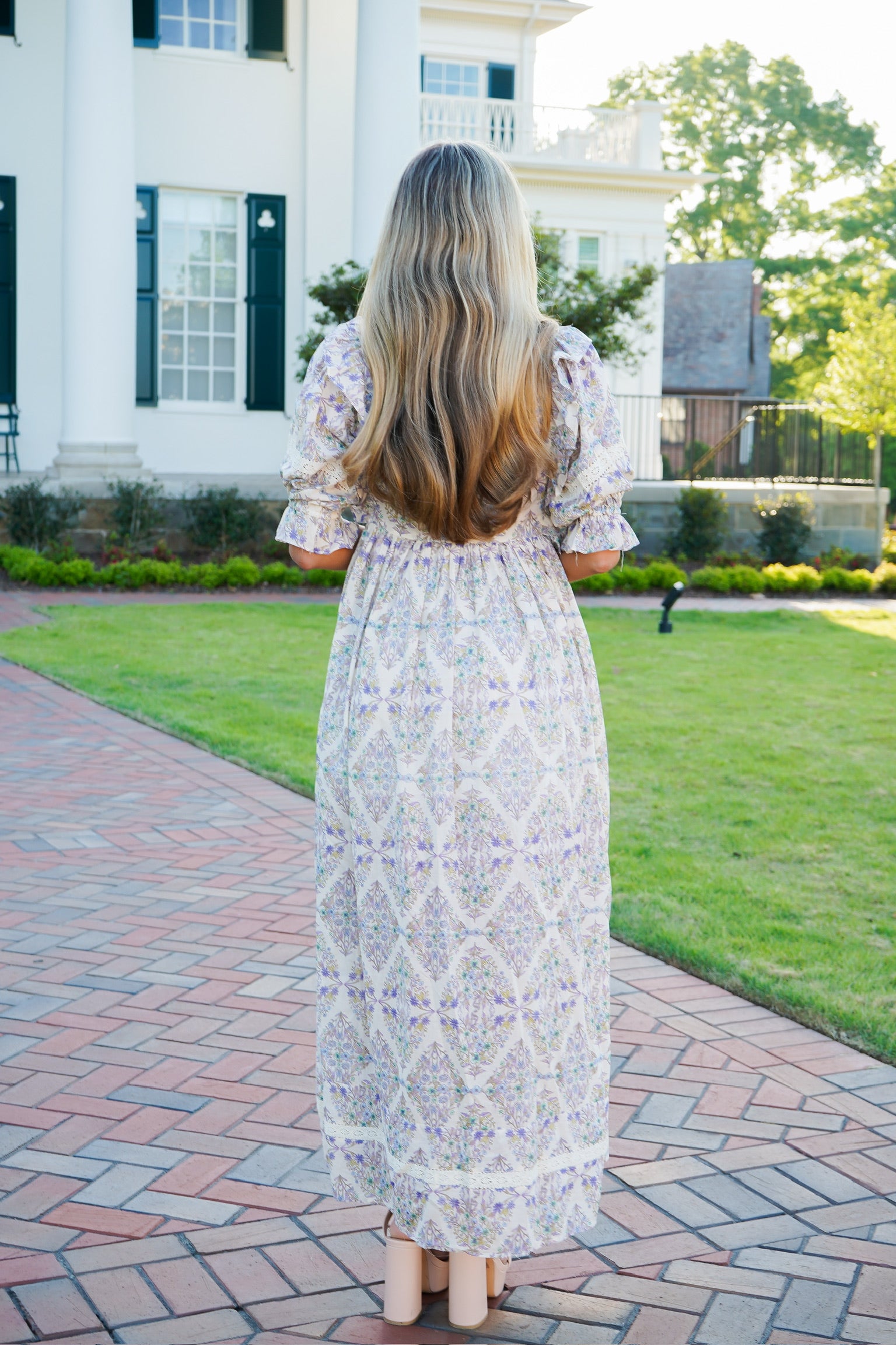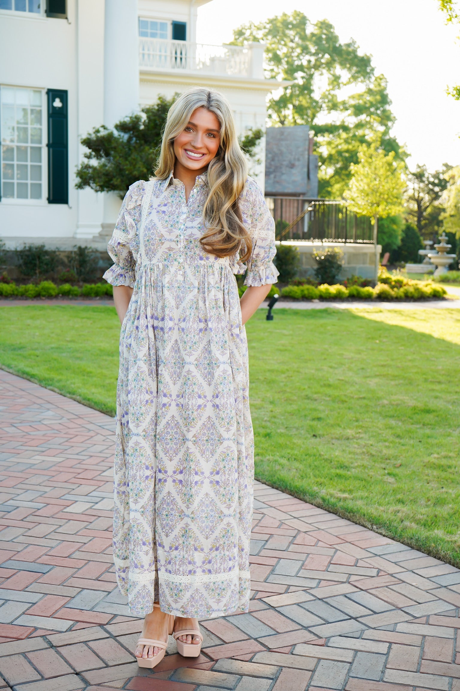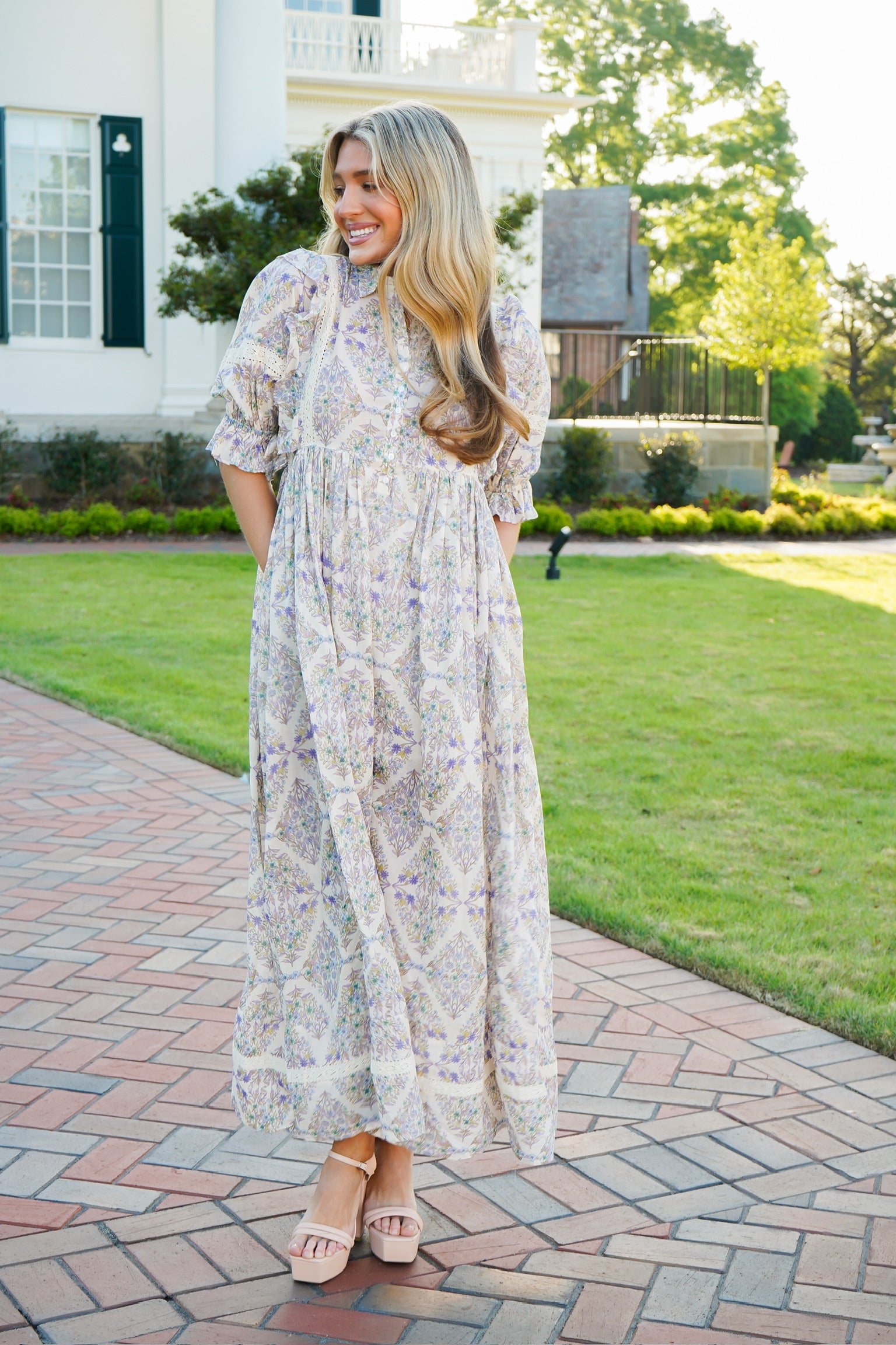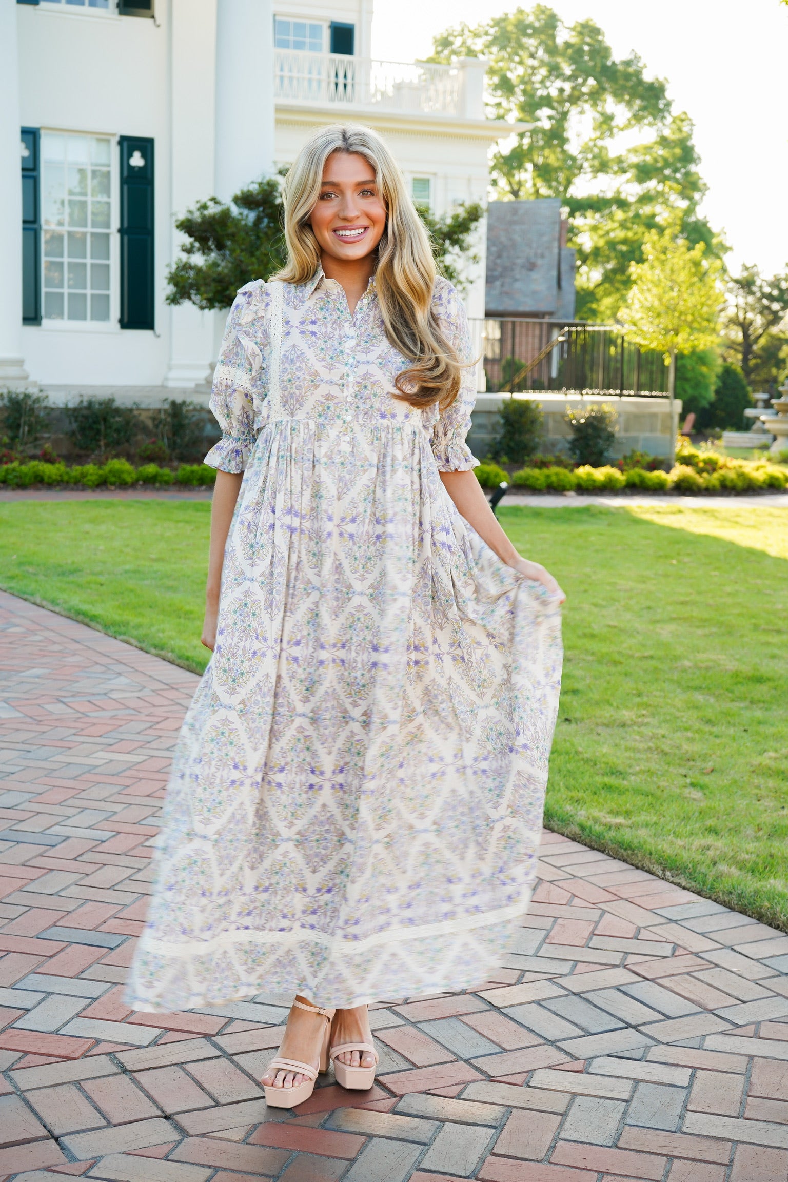Get ready to turn heads in the Pasadena Maxi Dress! This sand colored dress features a flirty puff sleeve and an intricate purple boho floral print. With a maxi skirt and front pearl button closure, this dress exudes effortless boho style. Say yes to your new go-to piece!