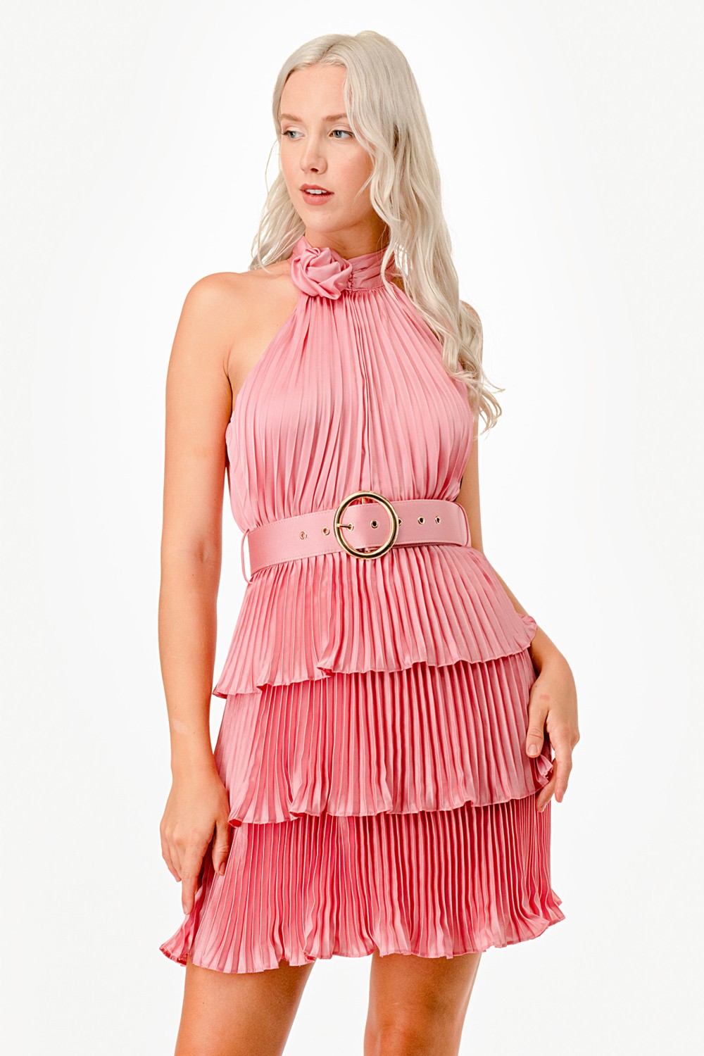 The Ren Mini Dress in pink brings a playful charm with its halter neck and flower corsage detail that beautifully frames the neckline. Crafted from pleated satin, its tiered layers add a flirty, twirling effect with every move. Complete with a matching belt and a back zipper for a perfect fit, this dress is ideal for making a fun and stylish statement at any event.