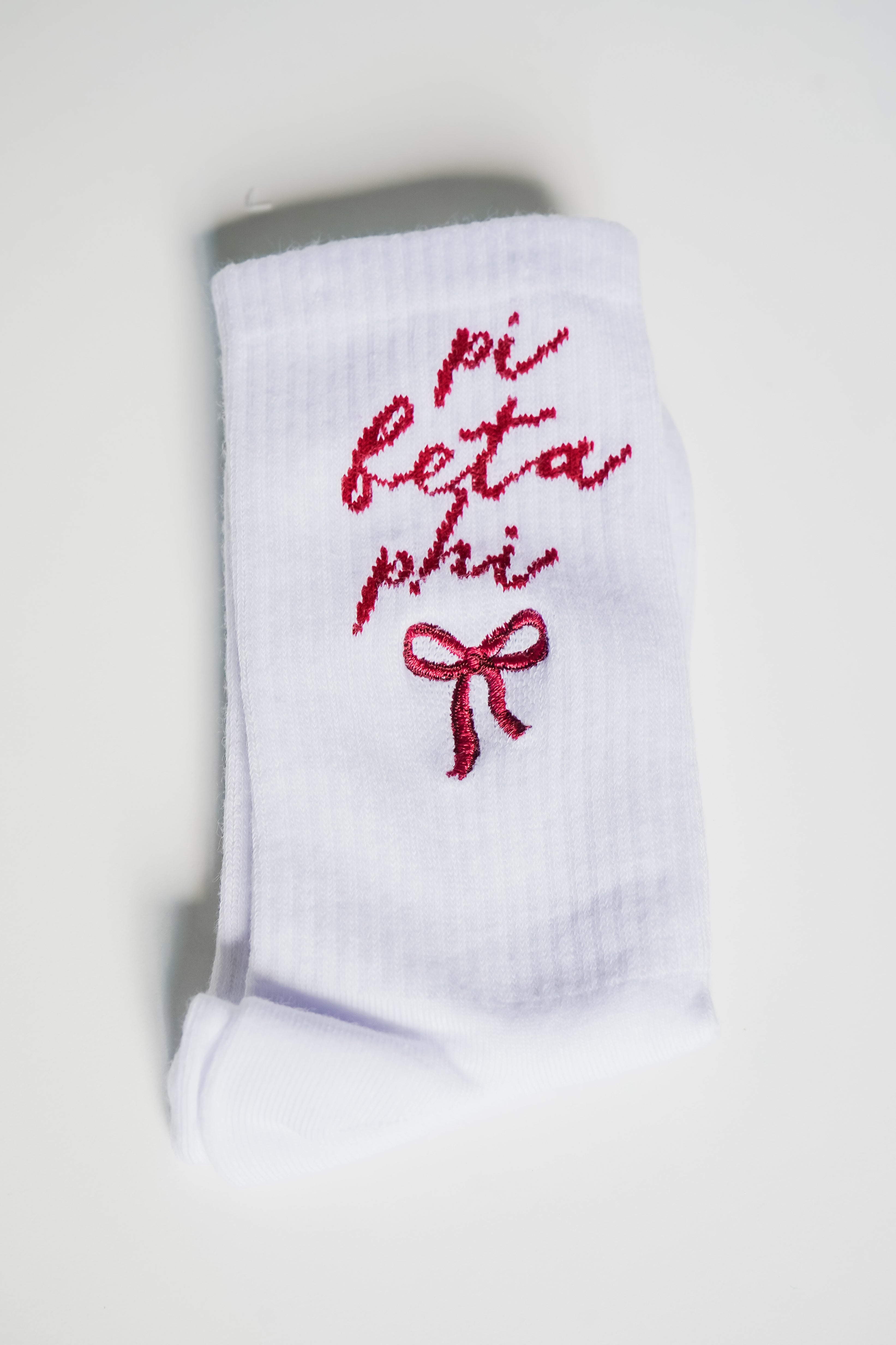 Rep your chapter in style with these adorable embroidered sorority socks! Featuring a sweet bow design and your chapter name stitched right in, they’re the perfect mix of cozy and cute. Made from soft, breathable fabric with just the right amount of stretch, they’ll keep you comfy all day long—from class to sisterhood events. Designed to fit women’s sizes 7–10, they’re the perfect little way to show your sorority spirit with every step.