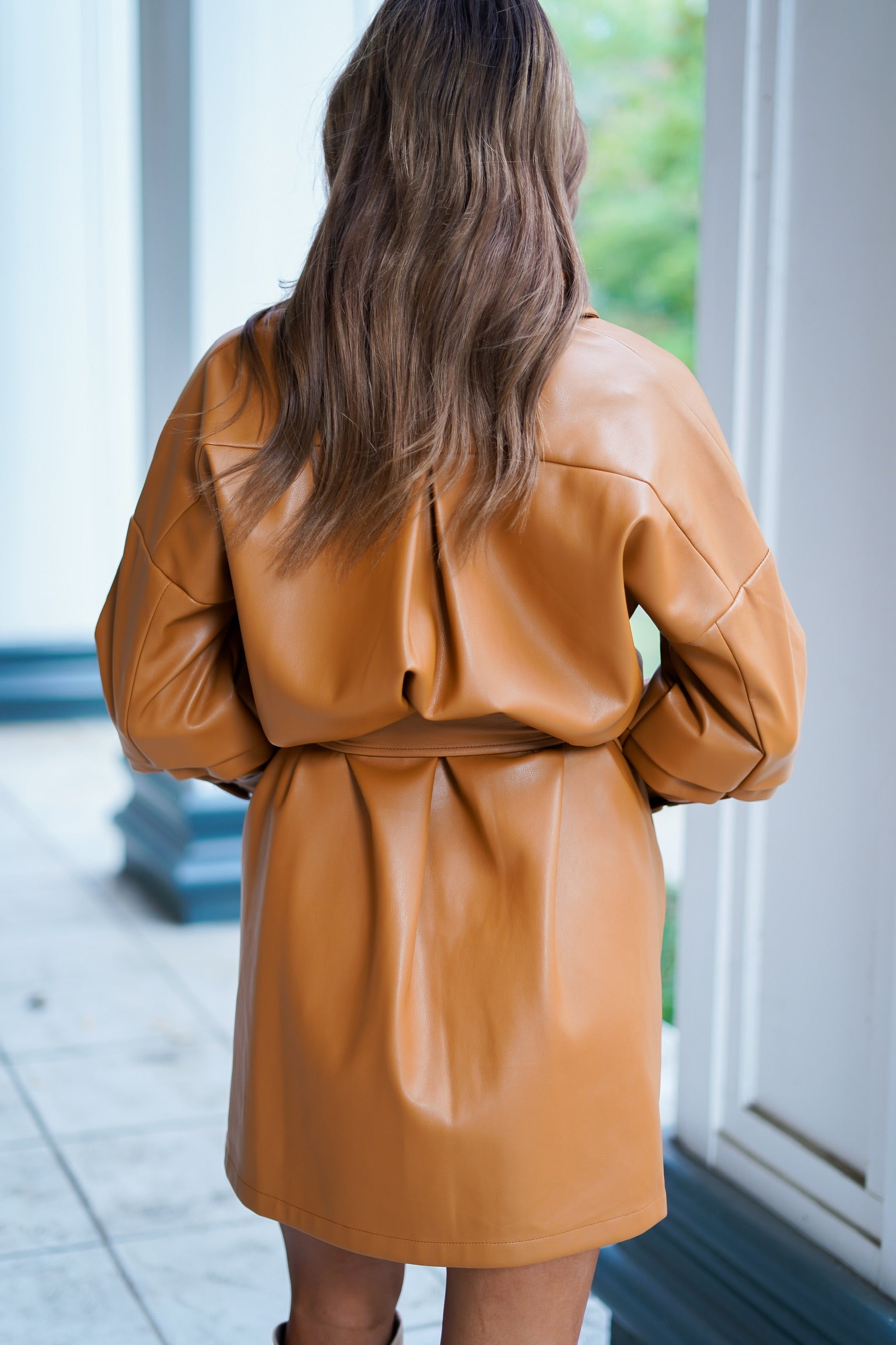 The perfect blend of edgy and sophisticated, our Faux Leather Belted Dress with Ruched Sleeves is a must-have for your autumn wardrobe. This sleek faux leather dress features a button-up design and a classic shirt collar, along with ruched three-quarter sleeves for a touch of drama and visual interest. It also features a waist belt to create a more flattering fit.