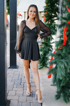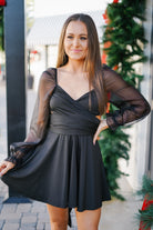 Vera two way mini! You can wear this dress with the straps crossed and tied in the front, or with a straight neck and bow in the back! The sheer sleeves are the perfect touch! Wear to GNO or date night!